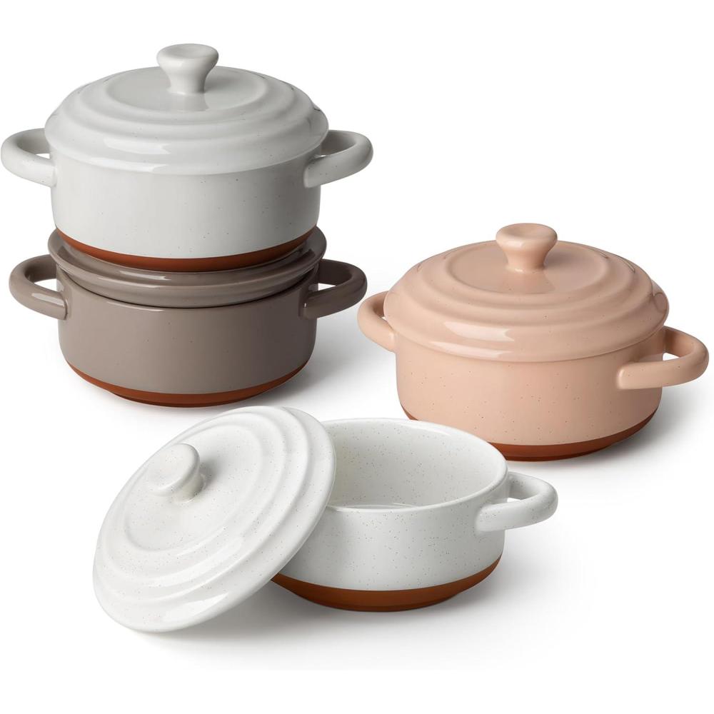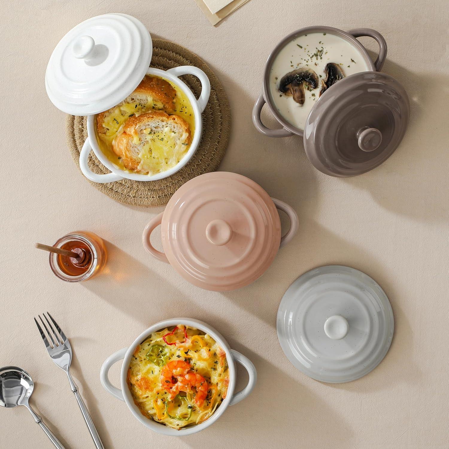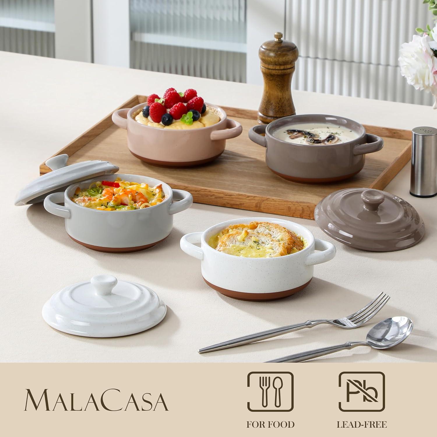MALACASA Mini Cocotte Set – 12 OZ Small Casserole Dishes for Oven, Ramekins with Lids and Handles, Ceramic Mini Dutch Oven Set of 4, Microwave & Dishwasher Safe, Khaki White, Series TARA(Multicolor)